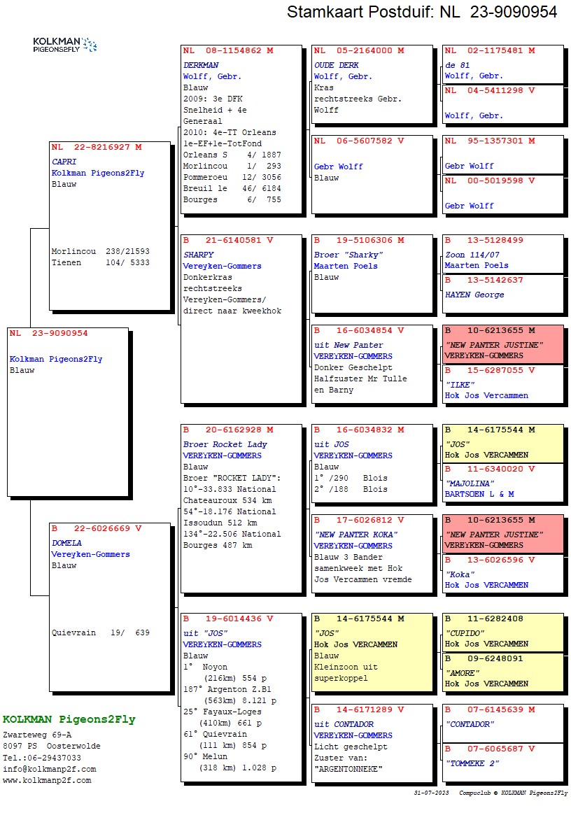Net nadat ik het bericht geplaatst had dat de tweede 1e plaats binnen was volgde direct nummer 3! Nu bij de jonge duiven en wel vanaf Bierges (B.) met een afstand van 213km. Het was de 954 die, totaal onverwacht, met hoge snelheid aan kwam stormen. Ik was net even het duivenhok binnengestapt nadat ik koffiepauze met vrouwlief had gehad en tante Anke die nog even op haar nieuwe elektrische fiets langs kwam en mij een vraag had gesteld om wat voor haar uit te zoeken had ik me geëxcuseerd omdat ik het gevoel had dat de duiven zo langzamerhand thuis moesten komen. Mede omdat van de voorhand (Harderwijk) al een paar meldingen binnen waren. Omgerekend zou dit voor Oosterwolde 10.36/10.37 uur betekenen. En ja hoor, ik had net op de klok gekeken waarop nog geen melding was weergegeven ("nog geen duif geconstateerd") en wou weer naar buiten gaan. Met dat ik de deur opende zag ik een duif over het hok scheren welke met een scherpe draai rechtsomkeert maakte en gelijk op de klep viel en geconstateerd werd: 10.37.48 uur. Dat dit toch een redelijk vroege duif moest zijn werd duidelijk door de melding: de 23-9090954 (klik op ringnr. voor stamboom), waar het hier over gaat, bleef lange tijd als vierde gemelde staan in de lijst van de regionale meldingen totdat.... Kampen, IJssel- en Genemuiden voorbij kwamen. Deze verenigingen rollen tot nu toe alle jongen duivenvluchten op. Zo ook deze vanaf Bierges. Maar desondanks een prima prestatie van het kleine blauwe duivinnetje de 954 welke als 28e getekende de mand was ingegaan. De 972 volgde als eerst getekende op anderhalve minuut als tweede van de 37 duiven die op deze vlucht mee waren. Dit was goed voor de 1e en 15e prijs in de vereniging en een 33e resp. 100e in de kring. Uiteindelijk stonden er 17 van de 37 op de uitslag. Hier kan ik niet ontevreden over zijn nu het prijspercentage nog.
